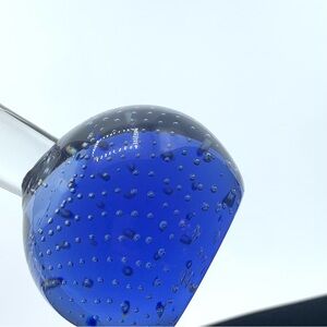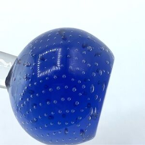 Beautiful Mid-Century Modern handcrafted controlled bubble glass bud vase with a striking purple base. This elegant 9” tall vase features suspended air bubbles throughout the clear glass—an iconic technique of MCM artistry.