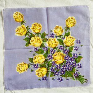 Beautiful vintage lavender handkerchief printed with a bright bouquet of purple violets and yellow roses. White rolled edge. Very good condition.