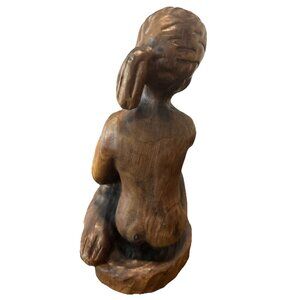 This vintage Mid-Century Modern handmade clay sculpture features a nude woman holding a duck, created in Spain during the 1960s. The natural brown sculpture is made of heavy wood with intricate carvings, standing at 9 inches tall and 4 inches wide. It is a unique and stylish addition to any collection, showcasing the craftsmanship and artistry of the time period. The antique finish adds to its charm, making it a standout piece for collectors of decorative figurines.