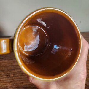 A charming vintage ceramic mug handcrafted in Italy, featuring a rustic hand-painted floral and geometric design. The earthy yellow and brown tones enhance its nostalgic appeal, making it a lovely collectible or functional piece.
