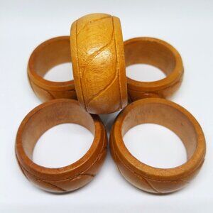 Vintage MCM Kemp & Beatley Carved Wood Wooden Napkin Rings - Set of 5