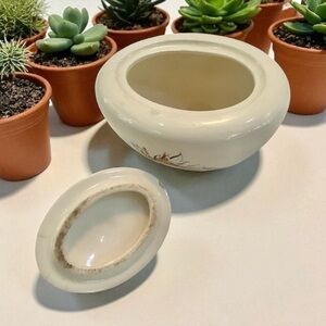 The Vintage MCM Knowles Sugar Bowl with a Leaves and Wheat Design is a charming piece of ceramic dinnerware from the mid-century modern era. Crafted in the United States, this oval-shaped sugar bowl features a creamy color with a glossy finish, making it a stylish addition to any kitchen or dining table. The sugar bowl is preowned and has imperfections- see pictures.