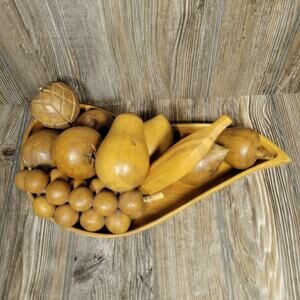 Vintage MCM Leilani Monkey-Pod Wood Bowl and Assorted Wooden Fruit