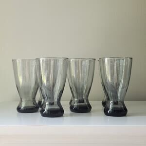 Tags: smoky gray glasses, mid century modern glassware, vintage tumblers, retro drinking glasses, 1960s glassware, curved water glasses, cocktail tumblers, vintage barware set, smoky glass cups, retro kitchen decor, smoky gray drinking glasses