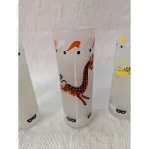 Vintage MCM Libby Circus Carousel Frosted Tom Collins Glasses. Set of 4 glasses, classic circus animals including tiger, lion, giraffe, and leopard, colorful bright prints, abstract flags and polka dots on top rim, great retro condition with no cracks and nice overall print.