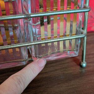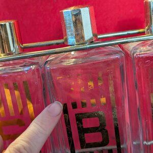 There is some paint loss on the bottles after being taped by a previous owner & 1 bottle has a different shaped lid.