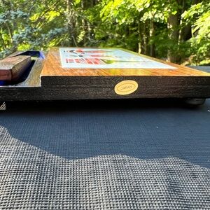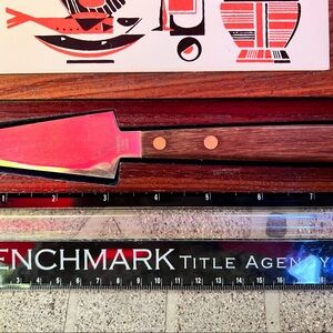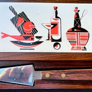 You will not find another one like this! Retro design circa late 60’s-early 70’s. It looks like it has never been used. Seems to be in excellent condition although it appears to attract a bit of dust on the surface. Recess for knife had some lint on the lining, which I did my best to remove. there also appears to be some tape residue on the edges of the knife holder, which I think was to hold the knife in place at one time. The colors are very vibrant, although it seems to photograph more red than orange. Measurements are as shown.