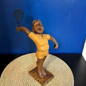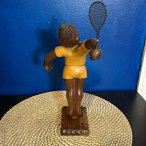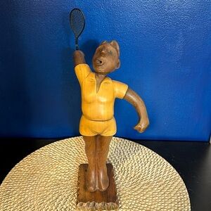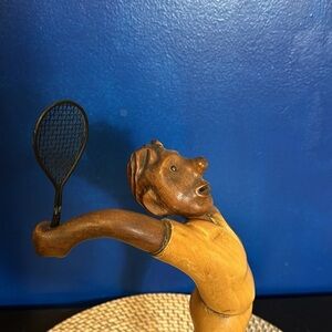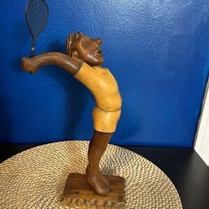 Vintage hand carved wooden figure of a male tennis player by Romer made in Italy. Sold by THE PRINCELY CO. INC. New York, NY. Great condition and smooth finish. Quality wooden art figurine. Measures 12 inches tall by 7 inches wide and 8.5 inches deep. Base is 4.25 inches by 3.25 inches, weighs 14.5oz.