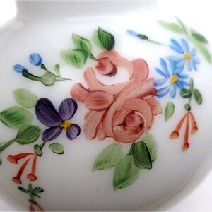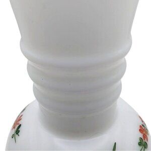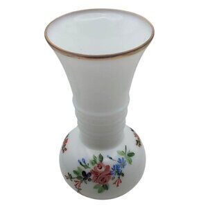 This charming vintage milk glass vase features hand-painted floral designs and elegant gold trim. Its ribbed neck adds a touch of sophistication.