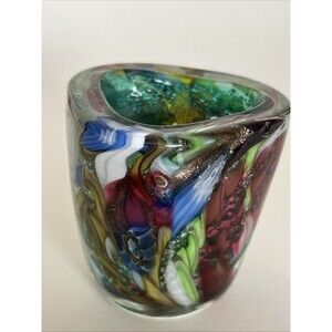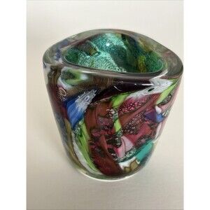 Hand blown. Tutti fruitti with silver, copper flakes. Beautiful teal green and blue swirls. White latticino. 2.5 tall. Toothpick holder or mini vase. 1 flea bite as pictured and 2 small bruises in the same area. Otherwise excellent with no cracks or chips.