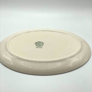 Made in the USA by trade union workers, this ceramic platter has a distinctive mid-century style. Measures about 14" x 10".