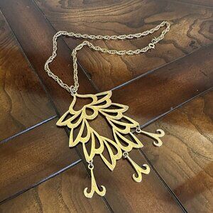 This vintage 19" necklace exudes a unique charm with its delicate floral pendant adorned with fluted dangles. The necklace is made from gold tone metal and features a tassel pendant/locket type, adding a touch of bohemian and retro flair to any outfit.