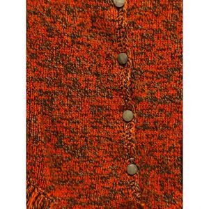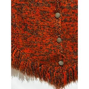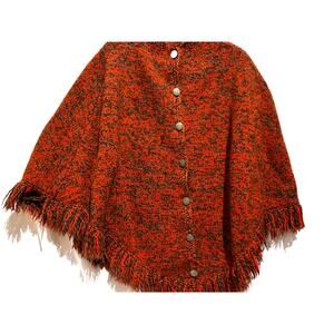 Vintage MCM Orange brown knit Poncho Shawl Wrap button Fringe Retro Warm boho OS