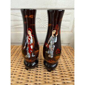 Vintage MCM Pair Lacquer wood footed Vases Inlaid Shell Geisha Girls
