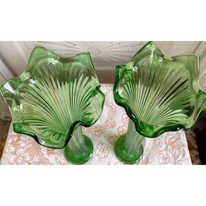 Vintage MCM Pair Ribbed Green Glass Swung Fluted Vases 12"