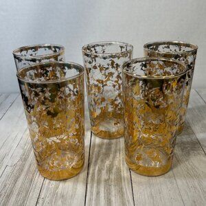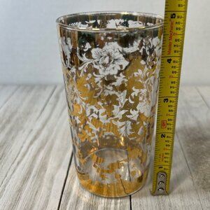 This vintage MCM pitcher set features a gold-embellished floral rose design and includes five matching tumblers, perfect for adding elegance to your collection or entertaining guests.
