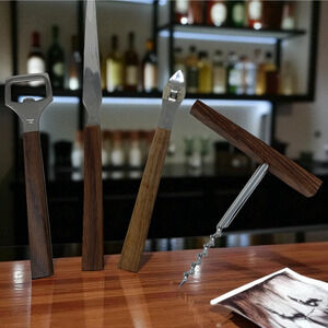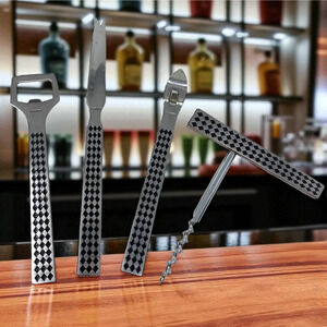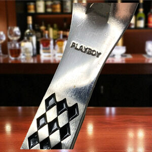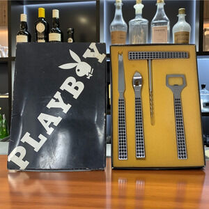 Vintage MCM Playboy 4 Pc Bar Set Checkered Stainless Steel & Teak Japan Boxed
