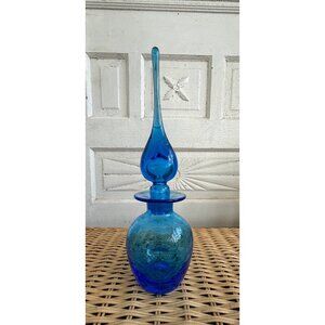 This vintage MCM rainbow art glass decanter features a striking blue crackle design with a flame stopper, perfect for collectors or home decor enthusiasts. This is about 12" with the stopper. There are no chips or cracks. It is in good vintage condition.