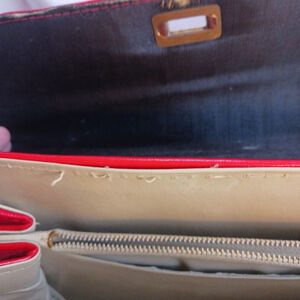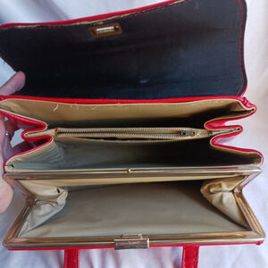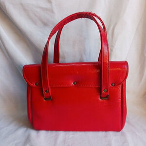This vintage handbag is perfect for any rockabilly or vintage fashion lover. The glossy red faux leather gives it a striking and bold look. With its double handle and boxy shape, this purse is stylish and practical for everyday use.