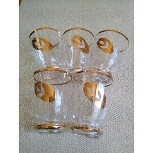 The 1950s and 1960s-inspired design of these shot glasses make them a great addition to any MCM or retro-themed home bar. The glasses are made of high-quality art glass and are perfect for both men and women. The set comes complete with a fun and kitschy vibe, perfect for any MCM barware collector. Quaint little cordial glasses sold EUC with all gold detailing intact. Please consider all photos part of complete description.