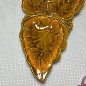 Beautiful leaf-shaped ceramic dish with a glossy finish. Gold Tone handle in center