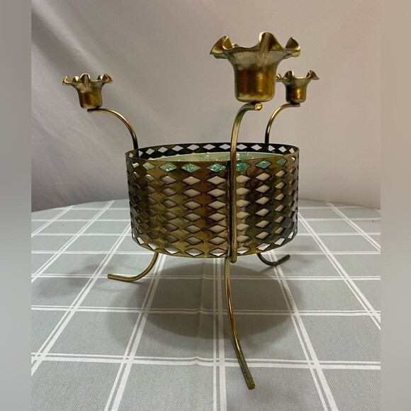 Vintage MCM Unique Gold Metal 3 Candle Holder Bowl Centerpiece Holiday Basket