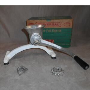 Vintage MCM Universal Tab-L-Top Food Chopper Landers Frary & Clark #1580. Vintage Food Chopper Grinder made by Landers Frary & Clark. Comes with original box and 3 different cutters. No instruction sheet but pretty simple operation. Very heavy! Nice condition for age. Please see pictures. Please note this is over 5 lbs and not eligible for bundle deals.