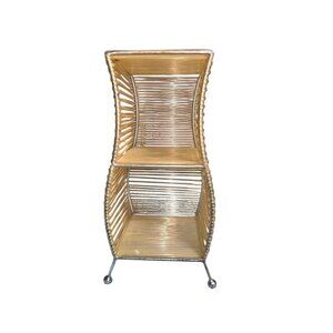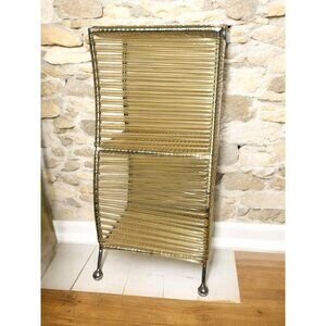 Vintage Mid-Century Modern (MCM) two-tier desktop shelf constructed with vinyl tubes. This style of shelf was popular in the 1960s and 1970s and is often referred to as "spaghetti" or "noodle" shelving due to the appearance of the vinyl tubes. The shelf features two tiers for storage or display and is supported by a metal frame.