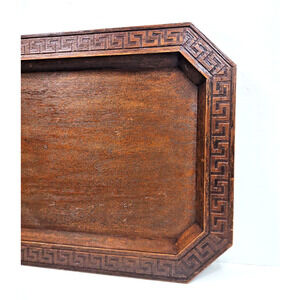 This vintage charcuterie serving tray is a must-have addition for any occasion. The rectangular shape and Greek key design around the edge make it a stylish choice for serving appetizers and snacks. The tray is made of plastic in a walnut wood tone, and it measures 21x14 inches, making it perfect for large gatherings.