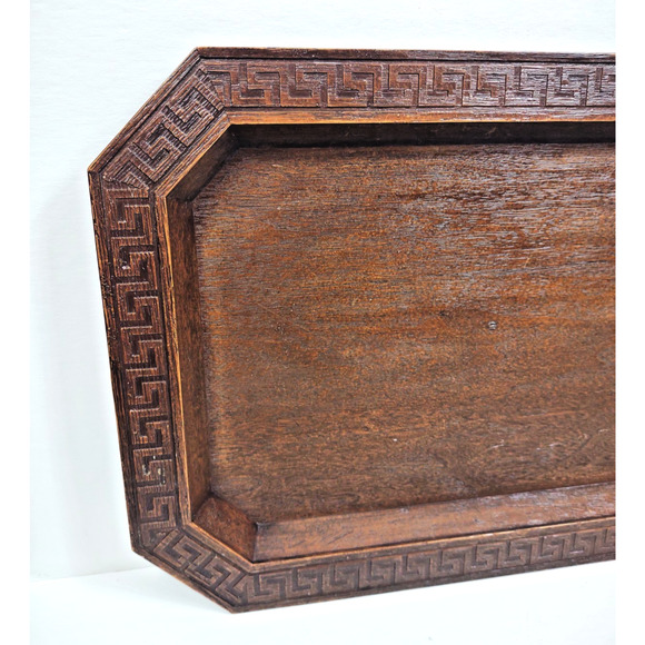 No cracks, cuts, melt spots or stains in wood, Dark wood tone colors with Greek Key around edge.