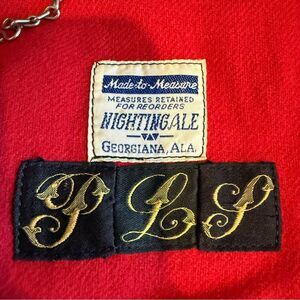 Vintage navy blue wool nurse's cape. red lining with interior pocket and arm slits present. Label denotes that the cape was made by Nightingale Uniform Company, which was registered in 1956, dating this cape to circa mid-century. Hospital initials on collar read "MBH."