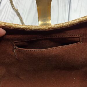 Mid century modern beauty! The exterior is woven but has a slight sheen in light that makes it look a little gold. Interior is a borne velvet, with a small tear as pictured. Overall good vintage condition