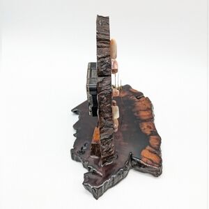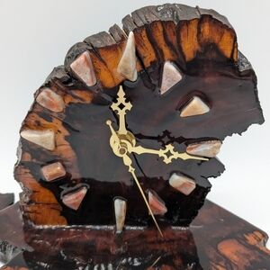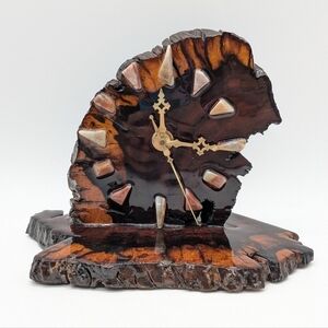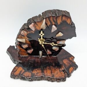 Vintage MCM live edge wood slab & stone table top clock. Some scuffing and needs the hands & battery pack replaced (see photos). Pink stones.