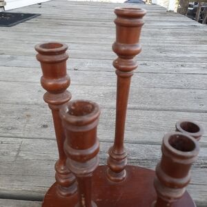 Vintage MCM mid-century modern dark wooden candlestick 5 graduated candelabra.