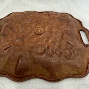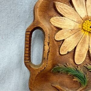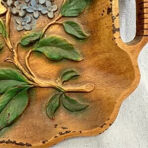 Vintage MCM scalloped wood look serving tray with raised painted floral pattern