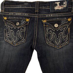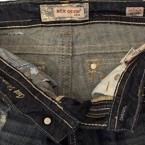Original Owner. 5 Pocket. OAXACA 26 Inch Waist/ 34 Inch Inseam. Boot Cut. Low Rise. 98%Cotton/2% Elastine. Machine Wash. Handcrafted. Incredible Detail. Gorgeous Garment. Back Flap Pockets with Signature M. Branded Buttons. Heavy Double Stitching Throughout. Intentional Deconstruction, Whiskering. Interior Printed Pockets and Interior Logo Detail.