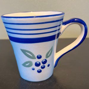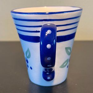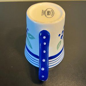 The sweetest mug ever, this vintage, handcrafted, tapered ceramic mug features a wrap-around design of fresh blueberries with stylized sage green leaves. Cobalt blue stripes and rim circle the upper portion of the off white mug. The large cobalt blue handle is decorated with a row of embossed white dots. Microwave and dishwasher safe. Measures 4.5 ” tall with a 4” diameter; 5.5” across including handle. Holds 16 fluid oz. From Mesa International; Warner, New Hampshire.
