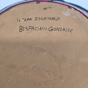 Vintage MEXICAN Ixtapa Terracotta Pottery Folk Art Hand Painted Large Bowl signed by Bespaciano Gonzalez.