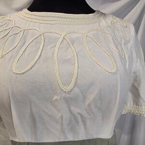 The Vintage M.H.M Melissa Harper Dress in size medium features a classic design in green and ivory colors. Made of rayon and poly, this knee-length pencil dress has short sleeves and a round neckline. Perfect for any woman looking for a unique and stylish addition to her wardrobe, this vintage dress exudes elegance and charm.