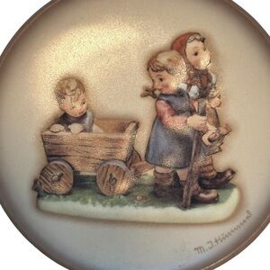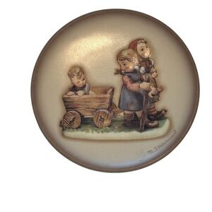 This collector's plate is an original design by Sister Maria Innocentia Hummel, also known as M I Hummel (or incorrectly as M J Hummel) and is part of the Century Collection Plate Series. The name of the piece is Pleasant Journey. It is a mini plate, barely 4" across, and features two young girls and a boy in a wagon, out on a walk. Both girls are pulling the wagon, while the girl in the red bonnet carries a package and the girl in the blue dress uses a walking stick. The little boy watches in wonder. The plate is beige with a brown painted rim. No chips, cracks or crazing.