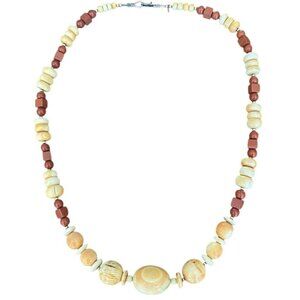 This vintage necklace features a stunning combination of bone and horn beads with red jasper accents. Measuring 27" long, its centerpiece showcases intricate craftsmanship, enhanced by its warm earthy tones. A timeless statement piece that reflects elegance and history.