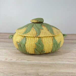 Vintage MKL Majolica Style Corn Soup Tureen Ceramic Lidded Vegetable Bowl