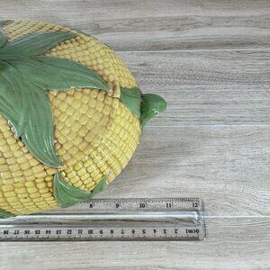 Vintage MKL Majolica-style soup tureen featuring a corn-on-the-cob design with leafy green accents. Hand-painted ceramic with matching lid and handles. Perfect centerpiece for farmhouse, cottagecore, or country-style decor. Signed MKL on the base.