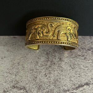 MMA (Metropolitan Museum of Art) gold Tone Cuff with engraved Elephants - Trunks up.