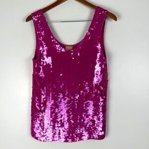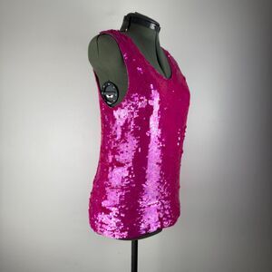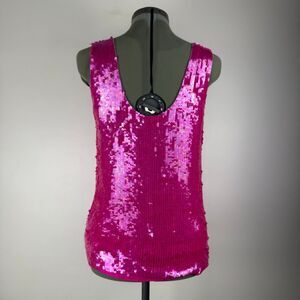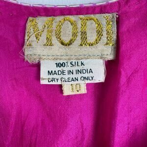 Vintage sleeveless sequin top by MODI, made in India from 100% silk. Features a vibrant hot pink silk base fully covered in iridescent pink sequins. Both the neckline and straps are finished with intricate beaded trim, extending around the deeper scooped back. Fully lined with the high-quality craftsmanship typical of hand-embellished Indian garments.