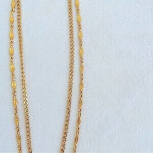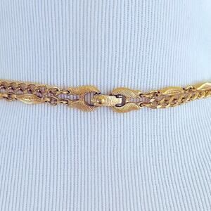 This beautiful statement necklace is gold tone and double strand / double chained. The pendant is gold tone with brushed gold accent as well. It has a brushed gold clasp. It is marked Monet on both the clasp and the pendant. In overall excellent vintage condition. Please see photos for additional condition and approximate size reference.
