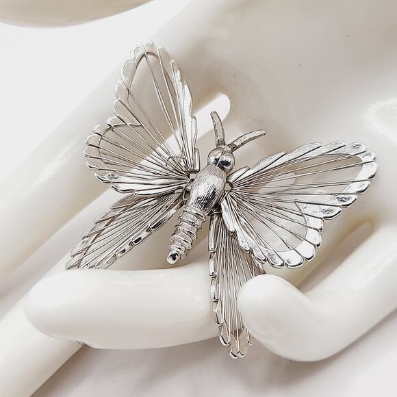 This is a beautiful vintage Monet butterfly brooch from the 1960s, crafted in rhodium plate with Monet’s signature openwork insect design. The layered wings feature fine wirework and sculptural metal detailing that gives the brooch dimension and movement.