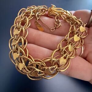 This is an exquisite vintage Monet gold tone heart link bracelet with safety chain. It measures 7.5" and the safety chain is 3". It's in great vintage condition with very minimal wear (a little on the Monet tag). A classic vintage bracelet that is just as fashionable today!