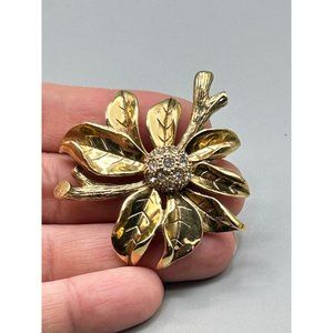 Vintage MONET Golden Flower Brooch Rhinestones Poinsettia Classic Pin Signed