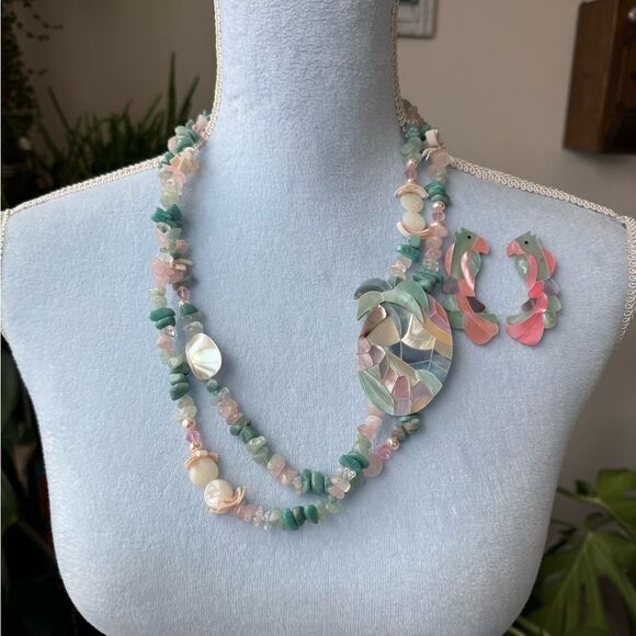 Vintage MOP Parrot bird rose quartz turquoise necklace earrings Lee sands